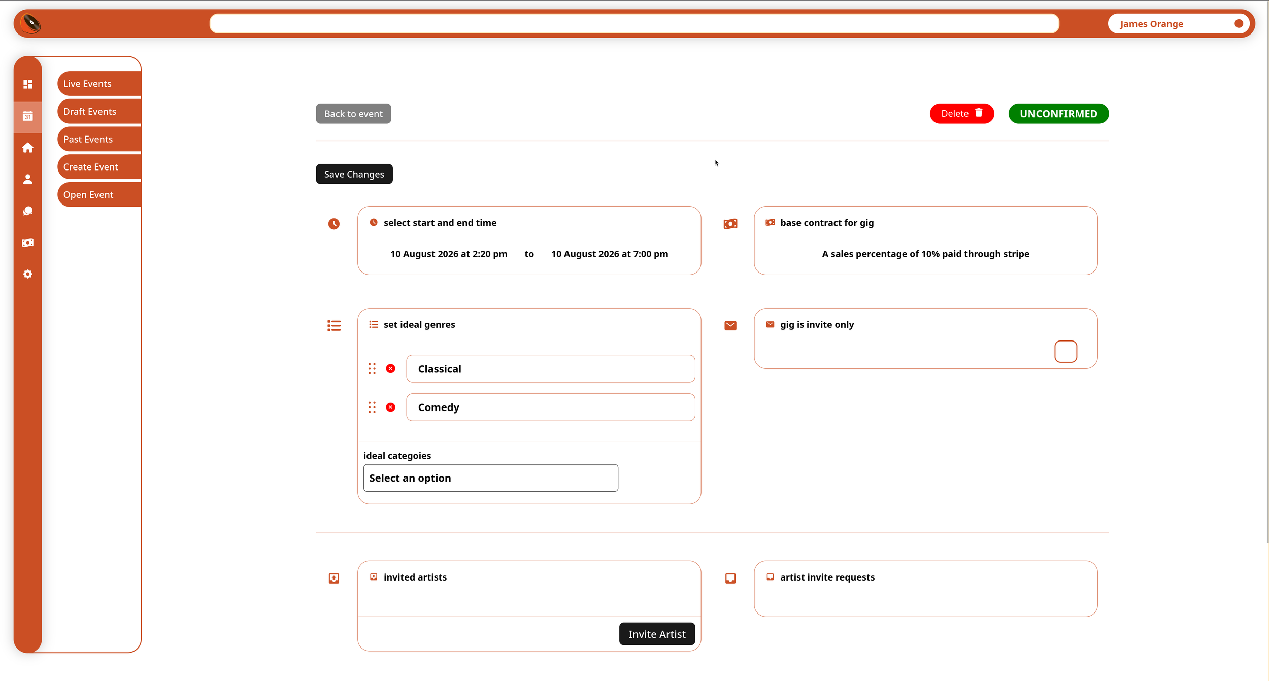 Sweet Orange provides a purpose-built content management system for live music and event operations. The CMS enables venues, promoters, and artists to create, manage, and publish events through a single interface. Core functions include event scheduling, venue management with geospatial mapping, ticket and product configuration, artist invitations, contract settings, and status control (draft, unconfirmed, upcoming, published).